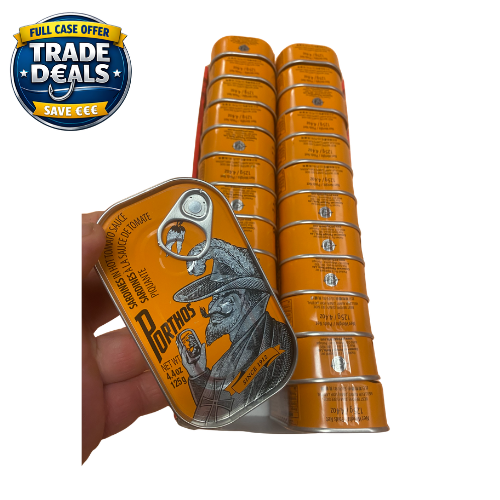 Box D€AL (x 24 cans) Porthos Sardines in Spicy Tomato sauce, only €2.70 each (save €0.55 each) Established in 1912, CONSERVAS PORTUGAL NORTE, LDA is a family-run company with great tradition in the production and trade of canned fish.