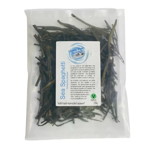 Our Sea Spaghetti is hand-harvested from the wild Atlantic shores of Sligo, by Carrraig Fhada. Long, ribbon-like, and naturally nutrient-dense , is wild sea vegetable hand-harvested from the pristine Atlantic coast of Ireland. Its subtle flavor and tender texture make it a perfect plant-based alternative to traditional pasta, rich in essential minerals like calcium, iron, iodine, and magnesium. Whether rehydrated for warm dishes, added to salads, or sautéed with garlic and olive oil, sea spaghetti is a delicious way to support your health while savoring the taste of the ocean.